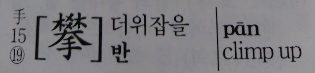 This morning a Korean friend wrote on Facebook that she had recently hiked up 남한산성, an old fortress just south of Seoul, near Seongnam City (성남시). The Korean word she used for “hiked up” was 등반 (登攀), which is a Sino-Korean word that my Korean-English dictionary defines as “climb up,” “scale,” or “make the ascent of.” I knew that the 등 (登) in 등반 meant “to climb” because I knew the word 등산 (登山), which literally means “to climb (登) a mountain (山),” but I didn’t know the meaning of 반 (攀), so I looked it up in my Chinese character dictionary and found that its English meaning was “climb up,” even though they spelled it wrong, and that means that both 登 (등) and 攀(반) mean “to climb,” causing me to wonder what the difference was between the two characters. When I wonder something like that, I usually look at the Korean definitions to find the difference, and for 등(登) the Korean definition was 오르다 (to go up or climb), and for 반 (攀) it was 더위잡다, a new word for me, or maybe it is a word that I learned and then forgot.
